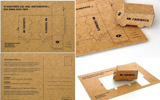 Fairways, importateurs chypriotes de voitures Renault, Jeep et Mitsubishi, déménageaient les salles d’exposition et la marque souhaitait informer ses clients des nouvelles adresses par mailing papier. Comment l’ont-ils fait ? Ils envoient des cartes contenant un motif de découpe à partir duquel chaque client pouvait créer une camionnette mobile avec le logo Fairways imprimé dessus. Il fallait y penser !