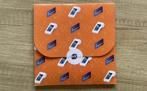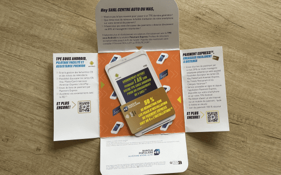 Nos clients ont souhaité un mailing papier, media premium, sous la forme d’une pochette au format carré, imprimée en full numérique, personnalisée recto verso et comprenant à l’intérieur un visuel cartonné en forme de TPE accompagné d’une carte bancaire fixé avec une colle fugitive, matérialisant ainsi le paiement sans contact.